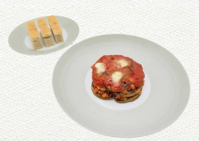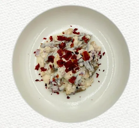 السعرات: Total weight 425 gr, Kcal 843 , Prot 47, Carb 96, Fat 34 لكل 100 جرام